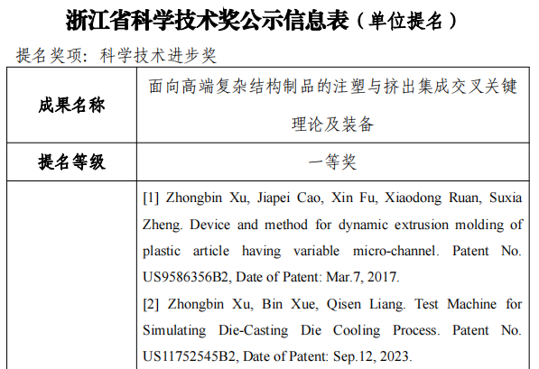 根據(jù)《浙江省科學技術廳關于開展2023年度浙江省科學技術獎提名工作的通知》有關要求,現(xiàn)將德清申達機器制造有限公司作為完成人工作單位的成果(成果名稱:面向高端復雜結構制品的注塑與擠出集成交叉關鍵理論及裝備)相關內容予以公示。公示時間:2024年8月9日-2024年8月15日。在公示期內如有異議,可以來電或來信方式反映。凡匿名異議、超出期限異議的,不予受理。聯(lián)系人:金萍萍電話:13706535940電子郵箱:Jinpp@injectionmachine.com
